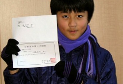 第1志望の洛南高校附属中学に合格をはたした奥田君。お父さんのVサインで受験勉強の苦労も報われました。